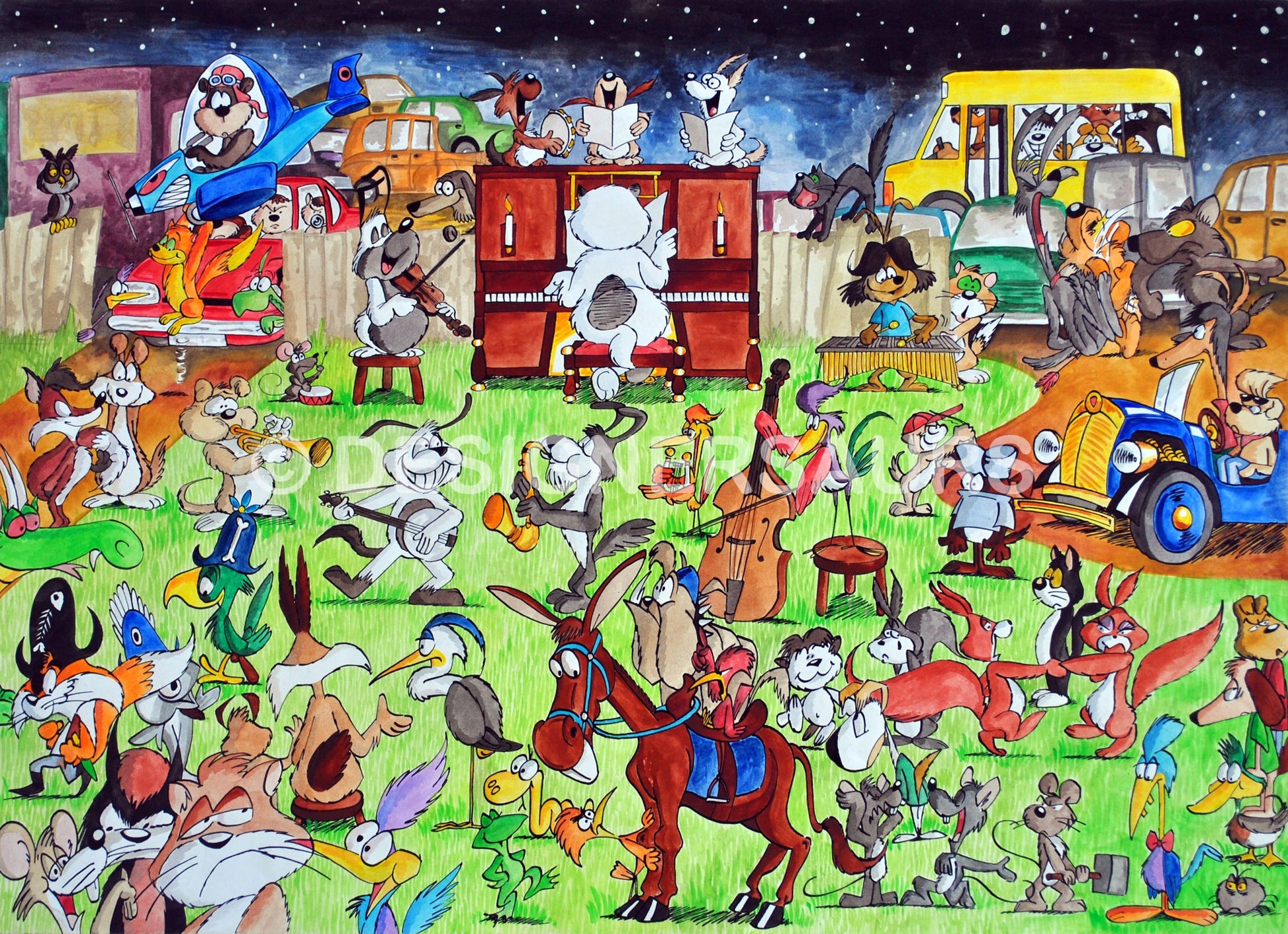 Busy cartoon animal illustration. Print on A3 2mm card.